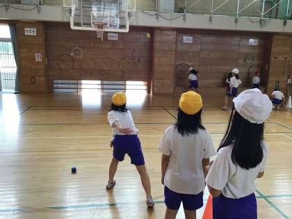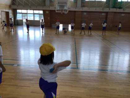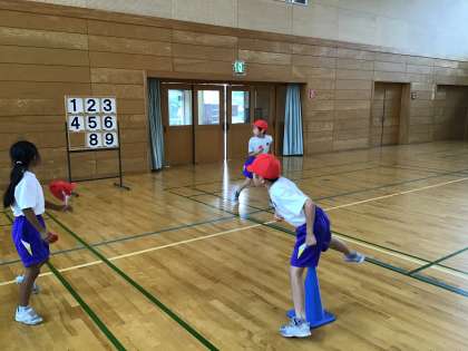 ボールを投げるときのフォームに気をつけながら、少しずつ投げる距離を伸ばしたり、的に向けて投げたりしました。