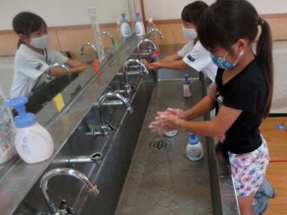 休み時間にはせっけんをつけてしっかり手洗い。