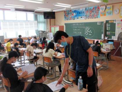 感染拡大防止のため、2クラス分を1教室にして授業を行っています。