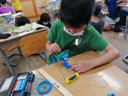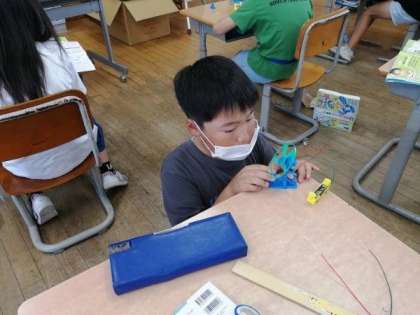 「今日、電池を入れたら、昨日と反対側から風が来るよ、どうして?」電流の流れ方を調べました。「わたしも、昨日と反対回りになった!どうして?」電流の学習キットを配るやいなや、「どうして?」の声がたくさん聞こえてきました。