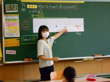 もう1つのクラスです。実際に竹ものさしを使って、鉛筆や消しゴムの長さを測ってみました。