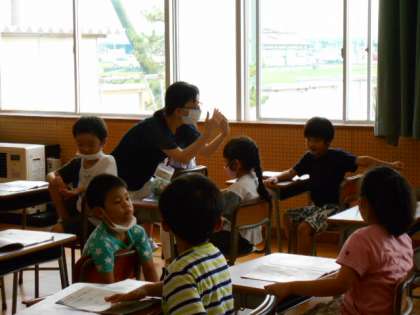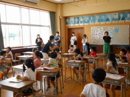 音楽科の学習で、果物の名前を言いながら、「タンタンタンウン」のリズム打ちのリレーをしました。好きな果物が音楽室を回っていきました。