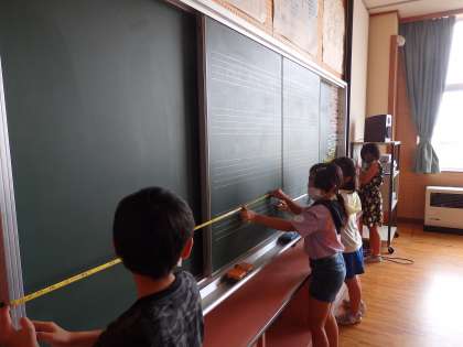 まきじゃくの使い方を勉強した後、実際に多目的室にある物の長さをはかりに行きました。はじを0に合わせておさえたり、ねじれていないか確認したりしながら、グループで協力して長さをはかることができました。
