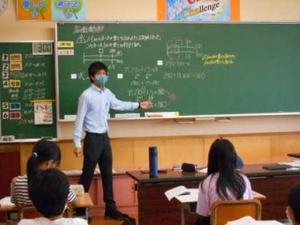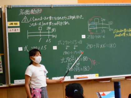 小数÷小数の初めての計算でも、既習の考え方を生かして答えを出すことできないか、考えました。自分の考えをしっかり説明すること、友達の考えをしっかり聞くことを通して、理解を深めていきます。