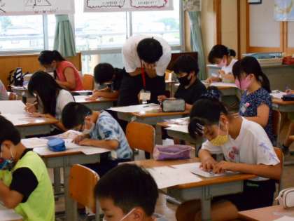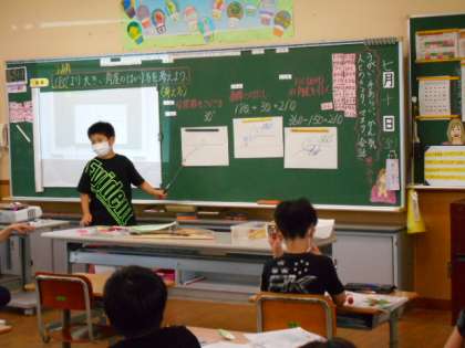 算数科の学習を行いました。分度器を使って角を書くことに挑戦したり、180度より大きい角をはかったりしました。前回の学習の内容を生かして角度のかき方やはかり方を考えていました。