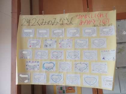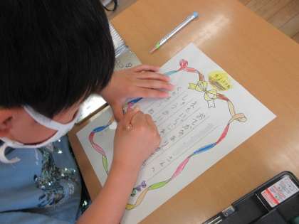 昨日の集会のお礼に、1年生から手紙をもらいました。「手紙のお返しがしたい」とすぐに1年生へ返事を書きました。同じ2階フロアで過ごしていたり、下校も一緒に帰ったりと、関わりの多い1・2年生。お互いの学年の優しさを感じた場面でした。