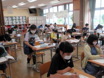 算数の確かめに取り組んでいる6年生。 悩んだときのための相談コーナーもあります。