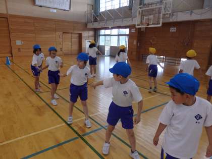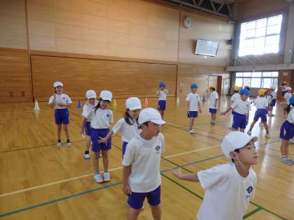 「はい!」とかけ声をかけながら、相手の手にしっかりバトンが当たるように渡す練習をしました。また、グループごとに、前の走者がここまで来たらスタートするという線を決め、走りながらバトンをもらいました。