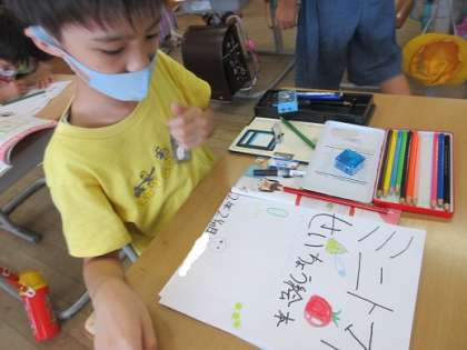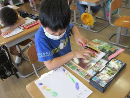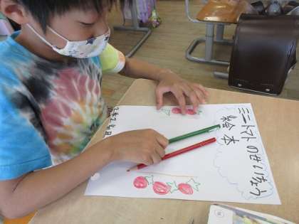 ミニトマトの学習も大詰めです。今まで観察してきたカードを本にします。今日はその表紙作りをしました。