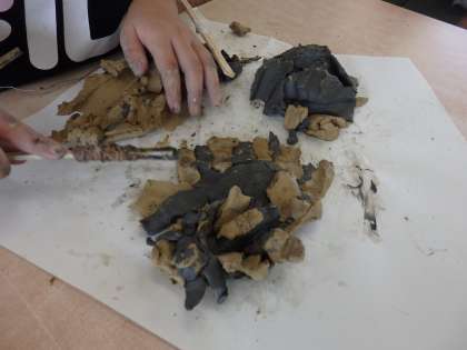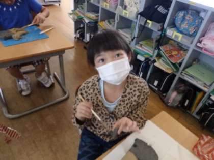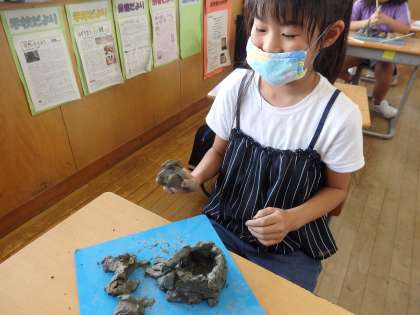 黒とクリーム色の二色の粘土を使って、かきべらでかき出したり、切り糸で切ったりしながら、形を作りました。