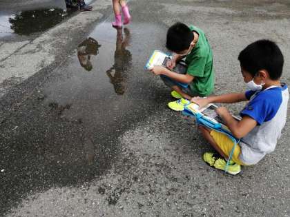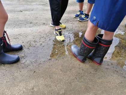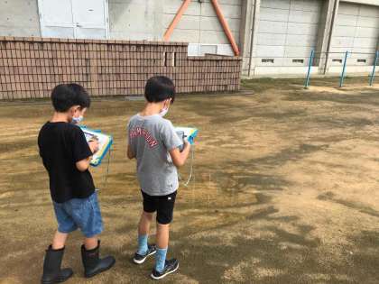 雨が降った後にはどんなところに水がたまるのか観察しに校庭へ出かけました。「凹んでいるところに水がたまっているよ!」「あれ、凹んでいるのに砂場には水がたまっていないよ?」「土の様子が違うのかな?」と考えながら観察をしました。