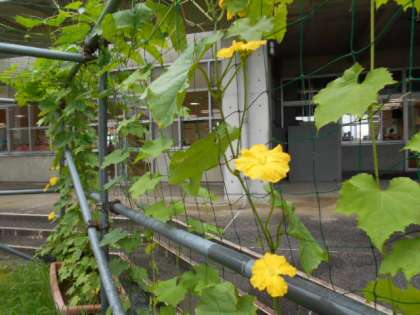 中庭で4年生の子供たちが育てているへちまの花が咲いています。毎日、心を込めて水やりをしてくれています。
