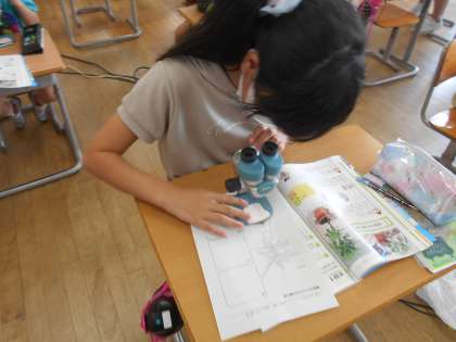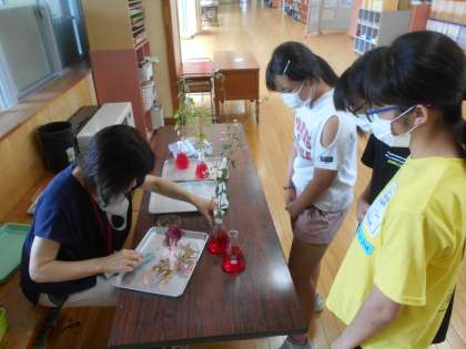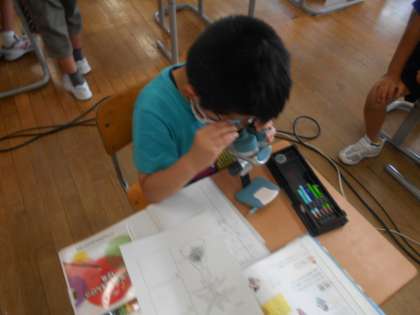 色付けされている植物の中身を、顕微鏡で観察しました。