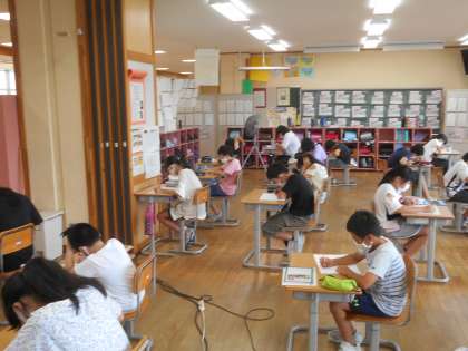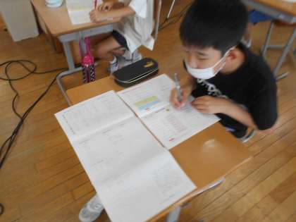 夏のチャレンジを使って、1学期の復習をした後に、期末テストに挑戦しました。力を発揮できたでしょうか?明日は、算数です。