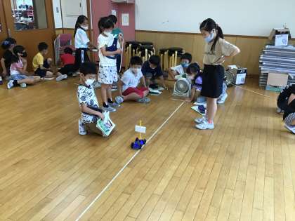 今回は、送風機を使い、風の力を利用して車を動かし、距離を比べました。