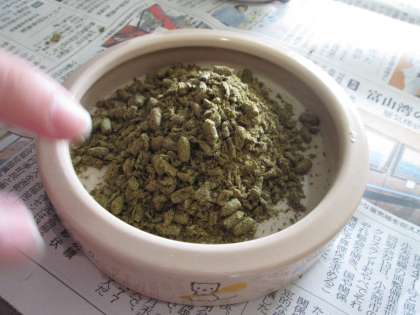 ペットフードあまり食べていないので、乳鉢を使ってすりつぶして食べやすくすることにしました。果たして、効果はあるのでしょうか。毎日、モフコの様子を観察しています。