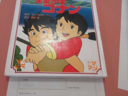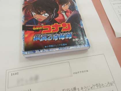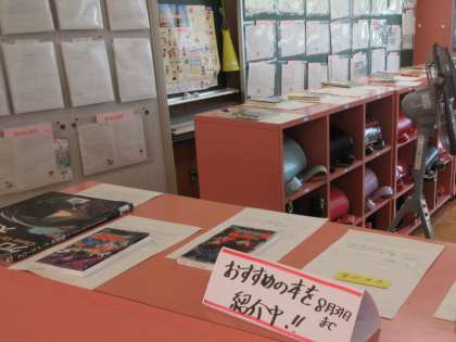 ロッカーの上に 子供たちのおすすめ本と おすすめポイントの紹介文があります。