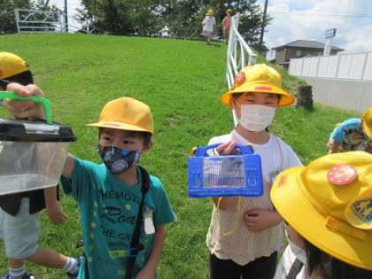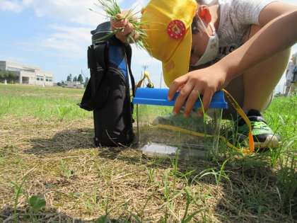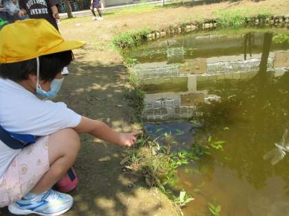 グラウンドで生き物を探しに行きました。バッタ、かえる、アメンボ、トンボ、、、、、たくさんの生き物を見つけることができました。じっくり観察したあとは、元の場所に戻してあげました。