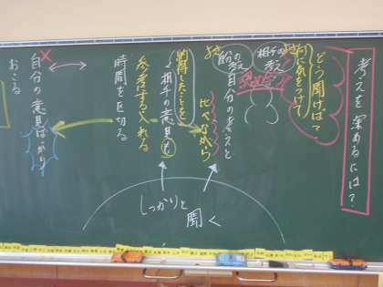 各グループでの話合いを終え、考えを深めるためには、どうやって聞いたらよいかをみんなで考えました。これからの生活に生かせそうですね。