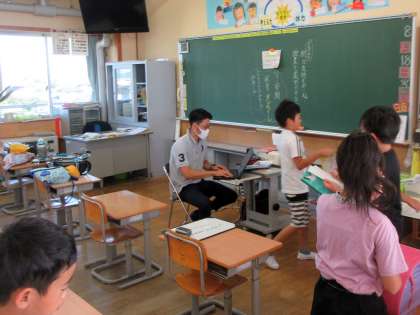 仕事をしながら、教室で子供を迎える先生です。