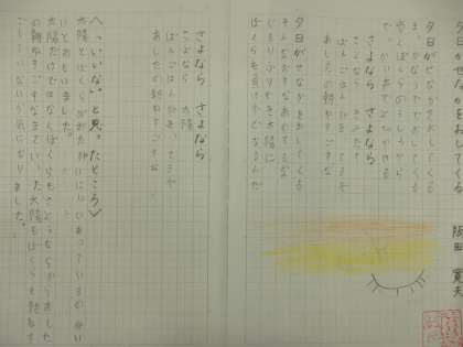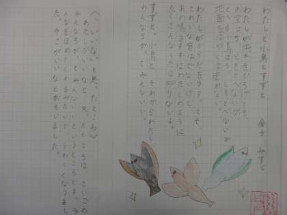 国語科では、「わたしと小鳥とすずと」と「夕日がせなかをおしてくる」の二つの詩を学習しました。今日は二つの詩のうち、「いいな。」と思ったほうの詩を視写しました。教科書をよく見て、ていねいに書いていました。