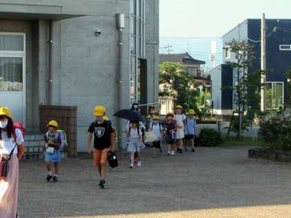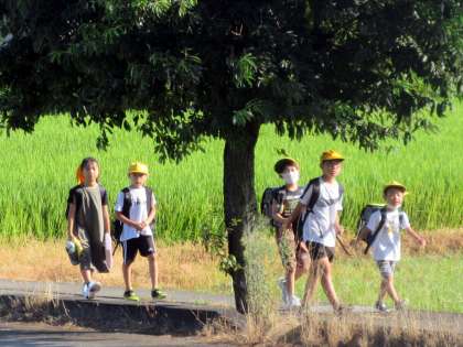 登校している子供たちの中にも、熱中症予防を優先してマスクを外している子、日よけ用の傘を使用している子がいます。