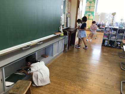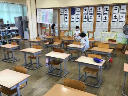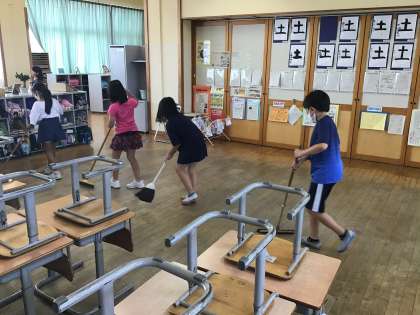 決まった場所の清掃が終わった子供たちは、自分たちで汚れた場所や、乱れている場所を見つけて掃除をしたり、整頓をしたりしています。
