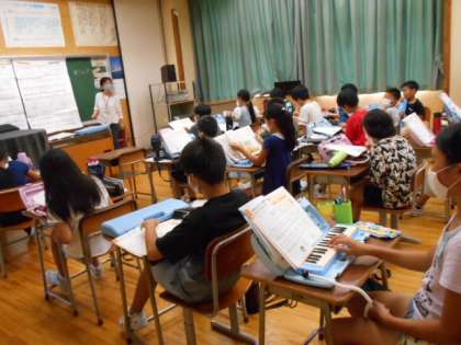 クラッピングファンタジーの旋律を鍵盤ハーモニカで挑戦します。演奏するには、階名を読めることが大切。小学校では、卒業までに基本的な調での階名唱程度はできるようになることを目指します。