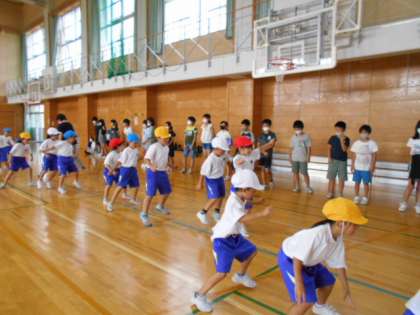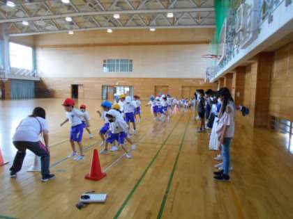 反復横跳びをがんばっています。上級生がお手伝いしてくれています。
