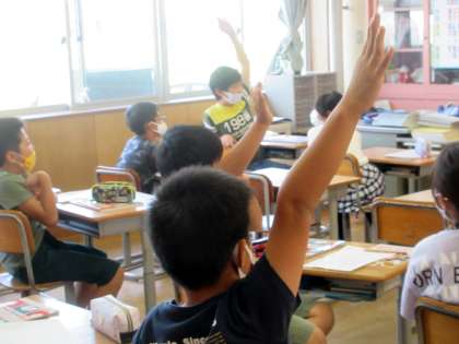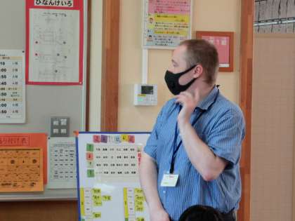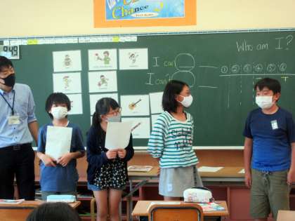 専科の先生とALTのリードで 「わたしは誰でしょう」ゲームを楽しんでいます。