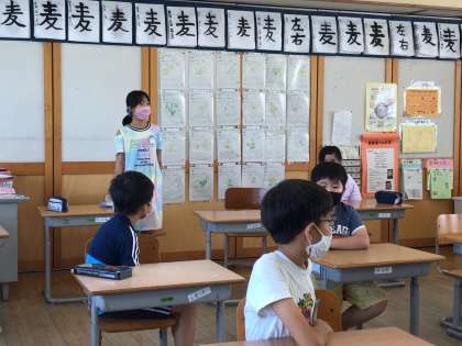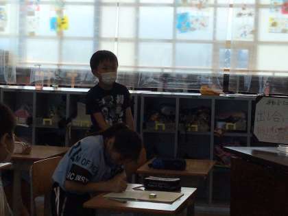 運動会のスローガンについて話し合いを行いました。自分たちで司会進行を行いながらスムーズな話し合いを行いました。自分たちの納得のいくスローガンを話し合いで作り上げることができました。