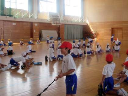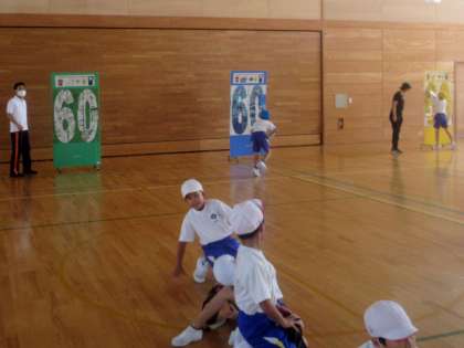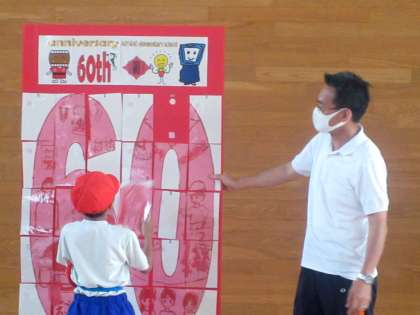 いつもの折り返しリレーに、今日は6年生がデザインした60周年パズル(宮野小学校は本年度が創立60年)が加わりました。