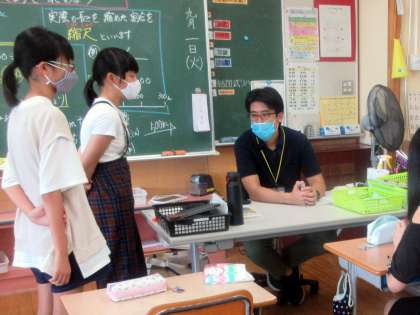 6年生の団のリーダーが、担任の先生に活動内容について相談中のようです。