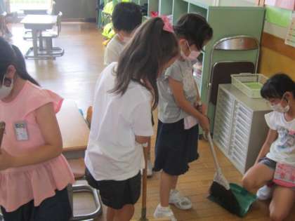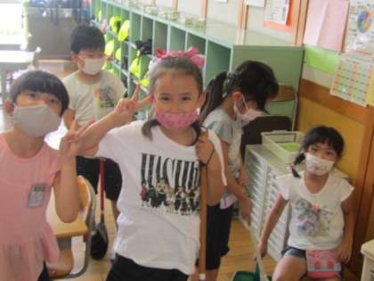 1年生にとっては、今日が初めての「宮野タイム」、読書したり、自由帳に好きなことを描いたり、マスクをして友達とおしゃべりしたり。なんと、ほうきやちりとりをもってそうじをする人も。教室がきれいになり、すっきりしました。