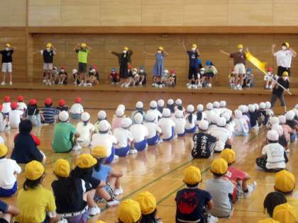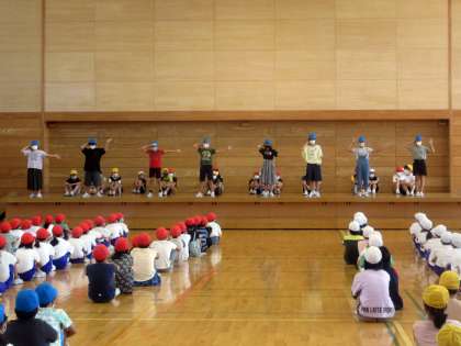 各色団の6年生がステージにあがって、応援エールを見せてくれました。