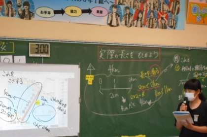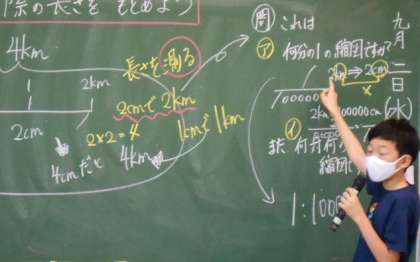 友達と考えを交流し合って、実際の長さの求め方を考えていきます。