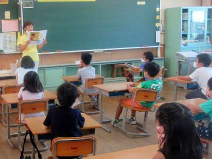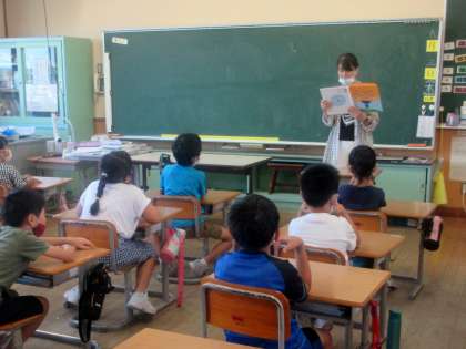 読書ボランティアによる「読み聞かせ活動」再開。 今日は低学年教室で実施しました。