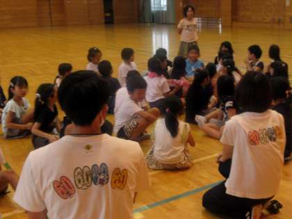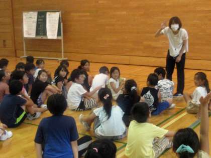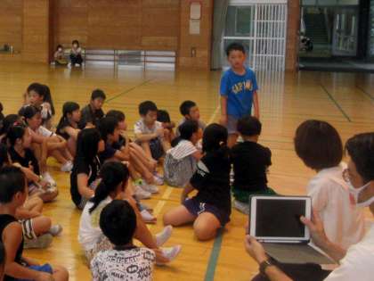 それぞれの班の創作ダンスをみんなでみたあと、感想を伝えあっています。