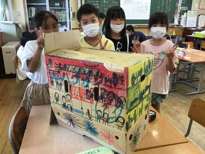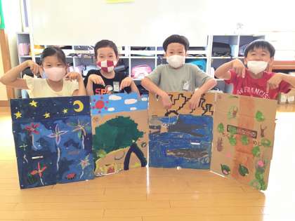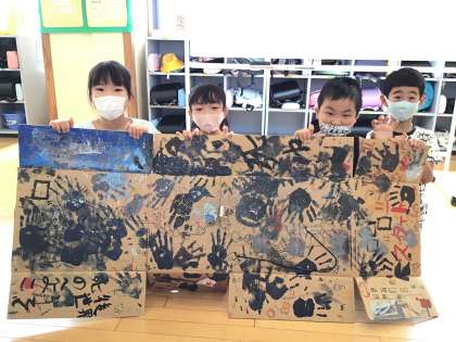 段ボールの形を生かし、絵の具の模様から着想して作品を仕上げる「ペタパタひらくと」が完成しました。思い思いの楽しみ方がとてもすてきでした。