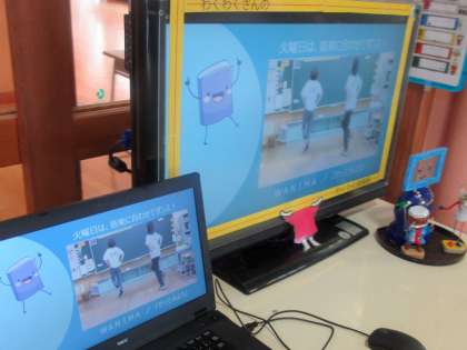玄関ホールのわくわくさん情報局(大型テレビモニタ)に、昨日のわくわくトレーニング時の、見本ダンスが流れています。