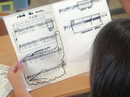 うたごえげんキッズハーモニーの再開に向けて、朝の会で音楽が流れています。