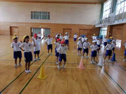 先日から始めた、体育科「リズム遊び」の学習。1年生は、軽快な曲に合わせて、楽しく踊っています。今日は、わくわくトレーニングで全校児童が取り組んでいる「やってみよう」を踊ってみました。一人一人が、リズムに乗って、回ったり移動したりすることを楽しむことができました。