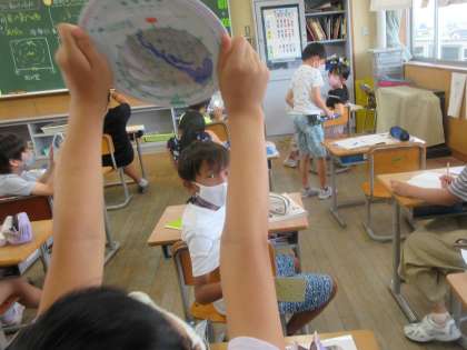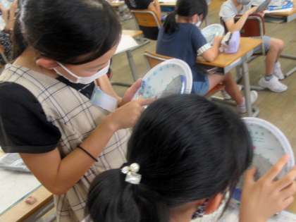 教室で星座早見盤を使いかたを確かめています。