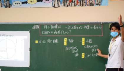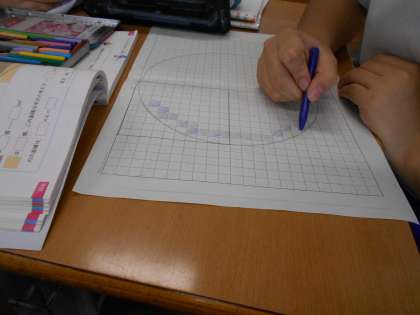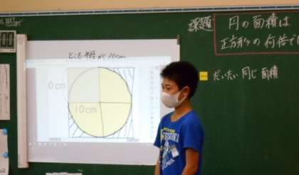 円の面積は、円の半径を一辺とした正方形の面積のおよそ何倍か、考えています。