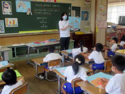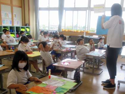 図工作品を先生が紹介。 すてきなところや、きになるところをたくさんみつけます。