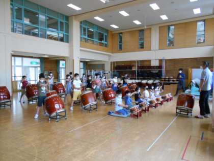 講師をお招きしての和太鼓の学習を再開しました。マスクを着用し、距離を通常より広く確保しての活動です。