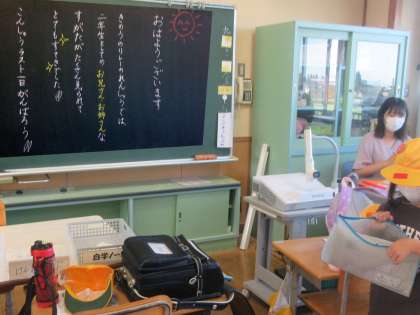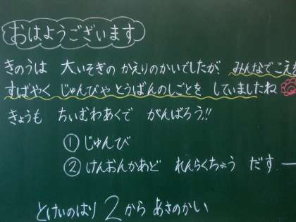1年生と2年生の黒板メッセージは、昨日のがんばりの評価。 2つとも花丸つきです。