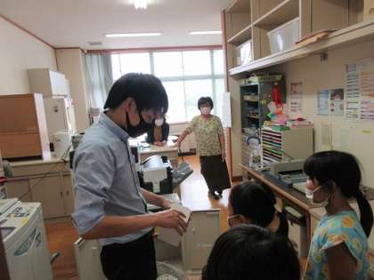 職員室にいる先生に「箱あけてー!」と頼む子供たち。中には生活科の時間で作ったびっくりへびが入っていました。先生達の驚いた様子を見て、嬉しそうな顔の子供たちでした。