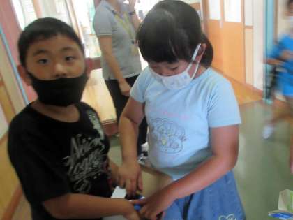 生活科でつくった自慢のおもちゃ。 いろんな先生に試しています。