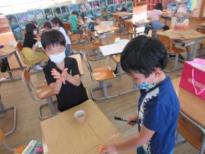 1年生に手作りおもちゃで遊んでもらうために準備中です。